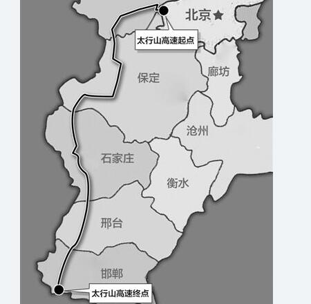 太行山高速公路自北向南貫穿太行山區(qū)全境,北連北京門(mén)頭溝,起自張家口涿鹿縣,經(jīng)保定、石家莊、邢臺(tái)、邯鄲等設(shè)區(qū)市,途經(jīng)17個(gè)區(qū)縣,輻射太行山30個(gè)區(qū)縣。其中已建成(張涿、張石、保阜、西柏坡高速)和在建路段(榮烏淶源段、京昆高速石太北線)共200公里;新建部分包括京蔚、淶曲、西阜、平贊、邢臺(tái)、邯鄲段6條段、415公里;另有淶曲、石家莊、邢臺(tái)三條支線65公里,新建段總計(jì)480公里,投資560億元,建設(shè)期3年,預(yù)計(jì)2018年建成通車(chē),屆時(shí)將形成連通北京、貫穿太行山南北的交通大通道。