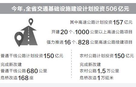 今年,河南全省交通基礎(chǔ)設(shè)施建設(shè)計劃投資506億元,其中高速公路計劃投資157億元。強力推進16個、828公里高速公路續(xù)建項目。普通干線公路計劃投資150億元,重點實施低等級公路升級改造、城鎮(zhèn)過境段建設(shè),完成新改建普通干線公路680公里,危橋改造168座;農(nóng)村公路計劃投資150億元,完成新改建農(nóng)村公路1.5萬公里,危橋改造1萬延米。